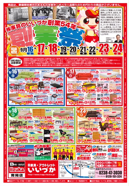 いつも当店利用、HPをご覧いただきありがとうございます。 今月9月2日より大好評開催中の『家具のいいづか創業祭!!』 連日多くのお客様にご来店頂き、誠にありがとうございます。 早いもので、今月も折り返しにさしかかりましたが、家具のいいづか創業祭はますますパワーアップいたします! なんと9月16日から3日間連続で、台数限定超特価品を販売いたします!!\(゜ロ\)(/ロ゜)/ ※詳細は折込チラシかHPでご確認下さい。 もちろんチラシ商品以外も全商品、高品質でお客様皆様に満足して頂ける商品ばかりです。 ぜひこの機会にご家族皆様で、家具のいいづかで、お気に入りの一品を探してみてはいかがでしょうか? スタッフ一同皆様のご来店心よりお待ちしております。